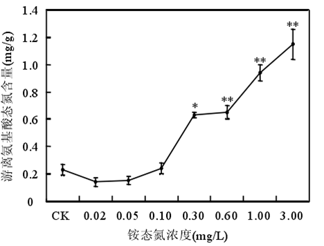 銨態(tài)氮濃度低于 0.60mg/時苦草生長良好,濃度大于或等于 1.00mg/L 時苦草的光合能力受到抑制、代謝受到干擾。苦草對銨態(tài)氮最敏感的生理生化指標(biāo)是葉片中游離氨基酸態(tài)氮含量。銨態(tài)氮作為沉水植物的一種營養(yǎng)物質(zhì),當(dāng)其含量較低時,植物由于營養(yǎng)缺乏誘導(dǎo)產(chǎn)生自由基。