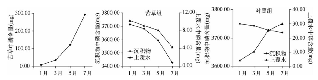 苦草對水體營鹽的去除率隨生物量的增加不斷增大,當(dāng)生物量達到 2380.00g時,去除率放緩。苦草腐敗釋放的磷大部分被底泥吸附,少量進入水體。草腐敗分解具有階段性,前36d分解迅速,以后分解速率顯著下降。